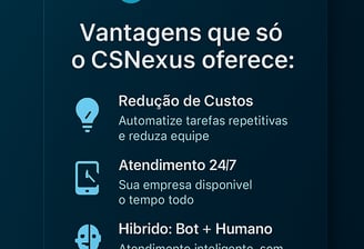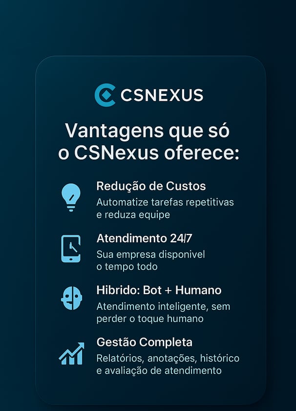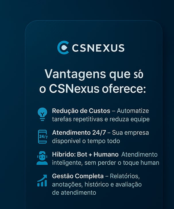 Automatize o relacionamento com seus clientes via WhatsApp, centralize atendimentos e otimize sua equipe com o poder da tecnologia CSNexus.
